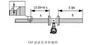 渦街流量計主要用于工業管道介質流體的流量測量,其特點是壓力損失小,量程范圍大,精度高,在測量流體工況體積流量時幾乎不受流體密度、壓力、溫度、黏度等參數的影響,可用來測量液體、氣體、蒸汽等多種介質,且維護量小、成本低廉,因此被廣泛應用于氯堿行業。 1渦街流量計的工作原理 渦街流量計是基于卡門渦街原理(karmanvor-texstreet)進行測量。當流體通過漩渦發生體時,發生體兩側會交替出現有規則的漩渦,這種旋渦稱為卡門渦街。而且兩側漩渦的旋轉方向相反(見圖1),每個漩渦將產生一個低壓區,傳感器監測壓力變化并轉換成脈沖信號。在流量計的允許量程范圍內,渦街的形成具有一定的規律。因此,渦街頻率與體積流量成比例關系。標定系數(K系數)為比例常數,也就是通常所說的儀表系數。K系數為流量計流量系數,其物理意義是每立方米流體的脈沖數。 在流量計的允許量程范圍內,K系數僅僅取決于流量計的幾何尺寸,與流體流速和物理特性(如黏度和密度)無關。因此,K系數與被測介質類型無關。 初始的測量信號(渦街頻率)已進行數字化處理,與流量成線性比例關系。流量計在出廠前通過標定確定K系數。 流量計的允許量程范圍主要取決于雷諾數(Re),Re是流體的慣性力和黏性力的比值,用于表征流體的流動特性。在采用渦街流量計進行測量時,當Re>4000后,儀表才會有顯示值;當Re>20000后,儀表的測量值才是線性的。Re的計算公式見式(1)。 式中:Qe為流體流量,m3/s;di為內徑,m;μ為流體動力黏度,Pa·s;ρ為流體密度,kg/m3。 2渦街流量計的特點 2.1優點 (1)安裝簡便,免維護(與差壓式流量計比較)。 (2)應用范圍廣,可以測量液體、氣體以及蒸汽(與電磁流量計比較)。 (3)測量液體、氣體或蒸汽時,儀表內置的溫度壓力傳感器直接補償,可得出質量流量、標況流量、熱量、比焓等值。 (4)成本低、壓損小(與科氏力質量流量計比較)。 (5)結構簡單牢固,無可動部件,使用壽命長。 (6)采用抗機械振動、抗沖擊和抗臟污的結構設計。 (7)更換傳感器后不需要重新標定。 2.2缺點 (1)量程比小于10∶1(質量流量計一般在25∶1,電磁流量計為100∶1)。 (2)管道振動對流量計影響較大。 (3)最小流量受Re影響。 (4)安裝要求高,對直管段以及墊圈同心度有較高的要求(質量流量計無直管段要求,電磁流量計要求其前面直管段長度為10DN,其后面直管段長度為5DN)。 3渦街流量計選型注意事項 渦街流量計按傳感器形式分為法蘭式、夾持式、插入式。選型時優先考慮法蘭式,其次是夾持式和插入式。原因是夾持式和插入式渦街流量計的精度受安裝影響較大,不規范的安裝將產生很大的測量誤差。 受Re的影響,測量液體時,一般情況下流量計口徑小于管道口徑一檔,測量氣體時縮徑在一檔到兩檔。要根據式(1)計算Re,具體要求是:最小流量時的Re>20000。如果擔心計算結果的準確率,可以委托渦街流量計生產廠家進行計算,廠家都有專業的計算軟件(如E+H公司的Applicator流量計算軟件),可根據用戶提出的要求(被測介質、流量范圍、溫度、壓力)計算出介質密度、黏度、聲速、流量范圍(精度范圍內)、壓損、流速、體積流量誤差、質量流量誤差、Re、渦街頻率、推薦的儀表口徑等參數。 變送器的選用方式有兩種:一體式和分體式,需根據現場使用條件和環境進行選型。在測量高溫介質或安裝在水井中的場合下,建議選用分體式儀表,以方便檢修、調試或改善變送器的工作環境。 在測量氣體或蒸汽時,渦街流量計的選型一定要考慮溫度和壓力補償問題[1]。因為氣體是可壓縮流體,當溫度和壓力變化時,其體積將隨之改變。所以測量氣體流量時均要求流量計輸出質量流量或標準體積流量,而渦街流量計是速度式流量計,只能測量工況下的體積流量,這樣就要求進行溫度和壓力補償,將工況體積流量轉換為質量流量或標況體積流量。測量一般氣體時,補償原理符合標準氣體狀態方程,方程式見式(2)。 一般氣體的溫度和壓力補償由上位機(DCS控制系統)通過其專用補償功能塊實現。 測量蒸汽時,不能使用標準氣體狀態方程,其一般有以下兩種補償方式可選用。 (1)有些廠家的渦街流量計傳感器內置溫度和壓力探頭,儀表根據所測溫度和壓力判斷蒸汽是飽和蒸汽還是過熱蒸汽,由儀表內部集成的蒸汽數據庫自動計算質量流量。當渦街流量計傳感器無內置溫度和壓力檢測元件時,只能在儀表內部做靜態補償(即輸入固定的溫度和壓力值用于補償)。此方法只適用于溫度和壓力變化不大的場所。 (2)采用蒸汽流量積算儀,將渦街流量計所測工況體積流量以及溫度和壓力變送器所測信號傳到蒸汽流量積算儀,通過蒸汽流量積算儀來完成溫壓補償。蒸汽流量積算儀內置過熱蒸汽以及飽和蒸汽所有數據,根據設計的流量測量單位可以輸出質量流量、標準體積流量甚至熱量和比焓等。 4渦街流量計的安裝要求 被測介質具有穩定流態是保證渦街流量計正確測量的前提條件,要使渦街流量計的測量值更穩定、正確安裝時需注意以下3點。 (1)務必確保傳感器銘牌上的箭頭指向與流體流向一致。 (2)渦街流量計對最小直管段的要求見圖2。當現場存在2個或過多干擾源時,建議遵循最長的直管段要求。圖2中的A表示前直管段,B表示后直管段,h表示管道擴徑時產生的高度差;DN為管道直徑。 當現場無法滿足直管段要求時,建議采用與渦街流量計配套的
